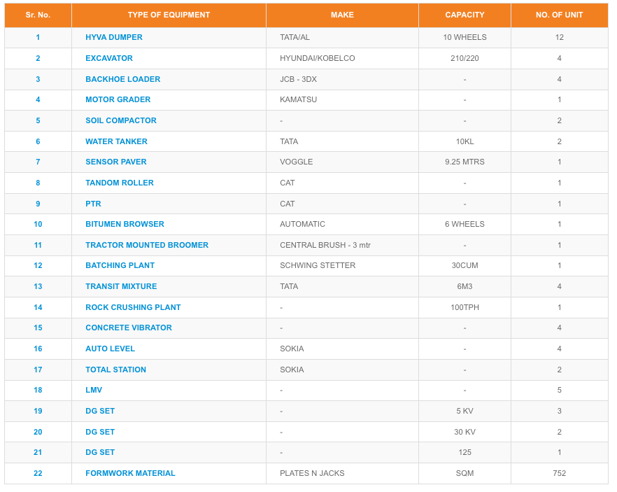 Sr. No. TYPE OF EQUIPMENT MAKE CAPACITY NO. OF UNIT
